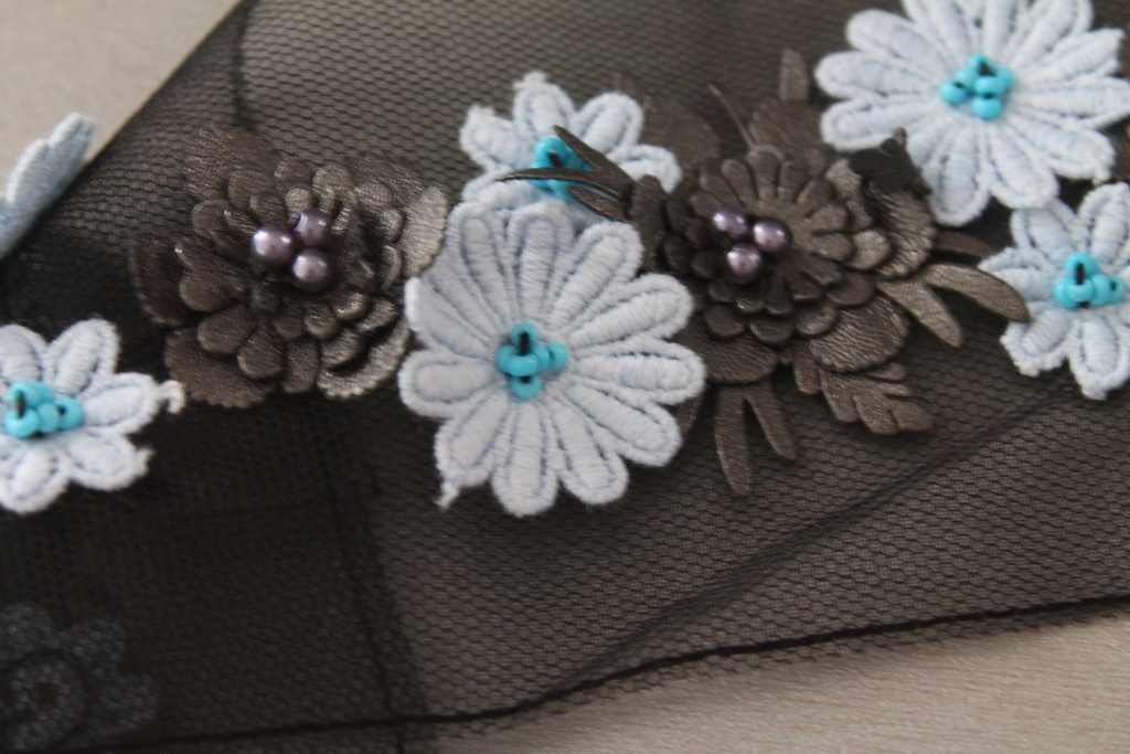 Черная сетка с объемными цветами из искусственноой кожи серого цвета.